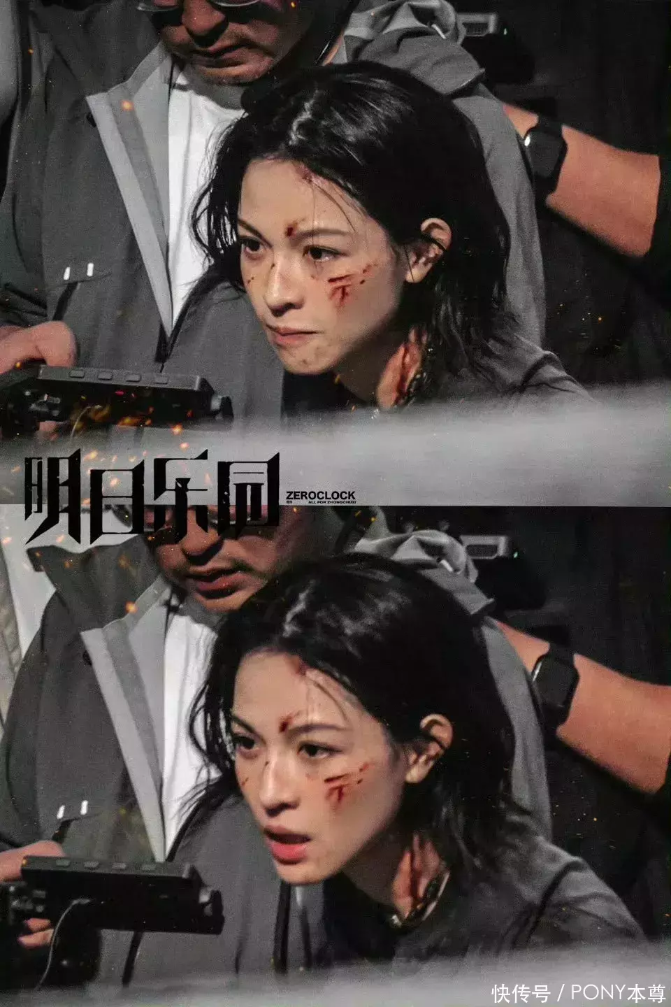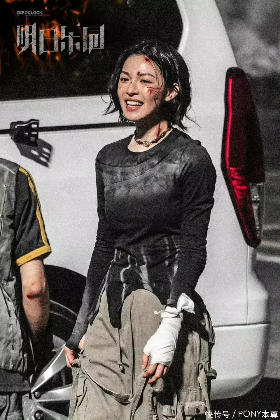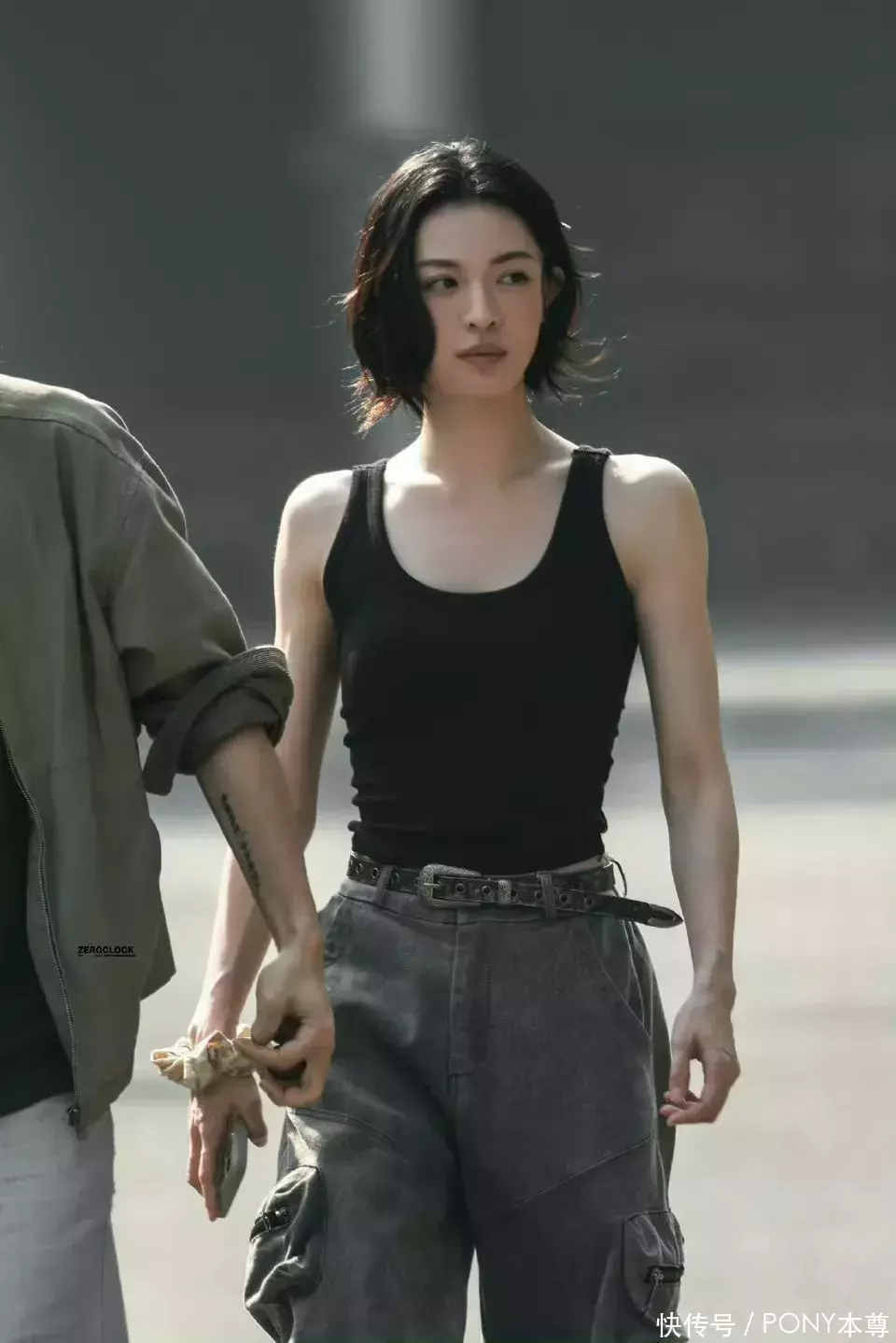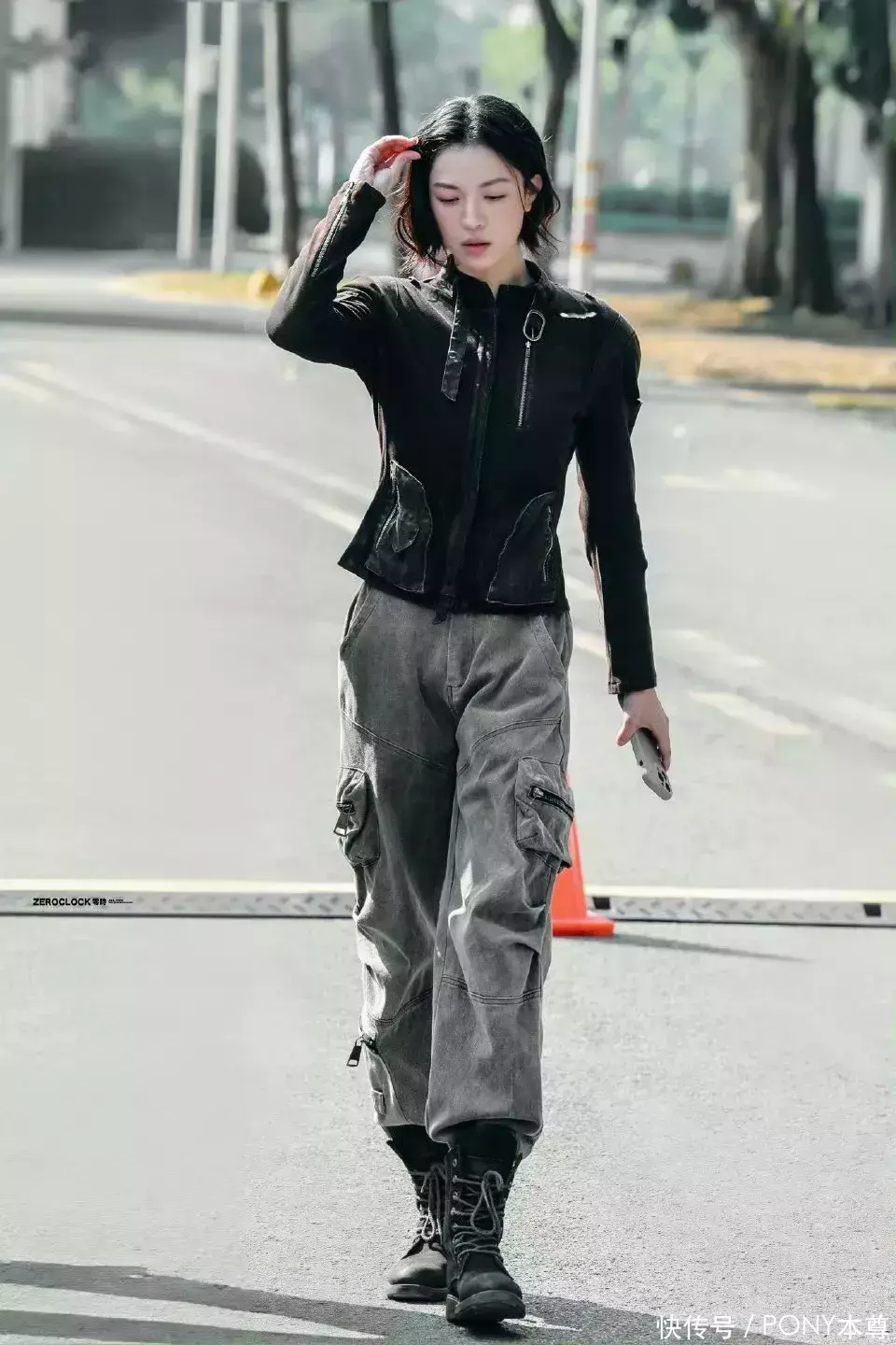 在拍摄现场,钟楚曦身穿一件不规则衣摆设计的长袖T恤,这种黑色和灰色拼接渐变设计,既能修饰身材又符合剧中人物形象,而下半身搭配的工装阔腿裤,则为穿搭增加帅气感!